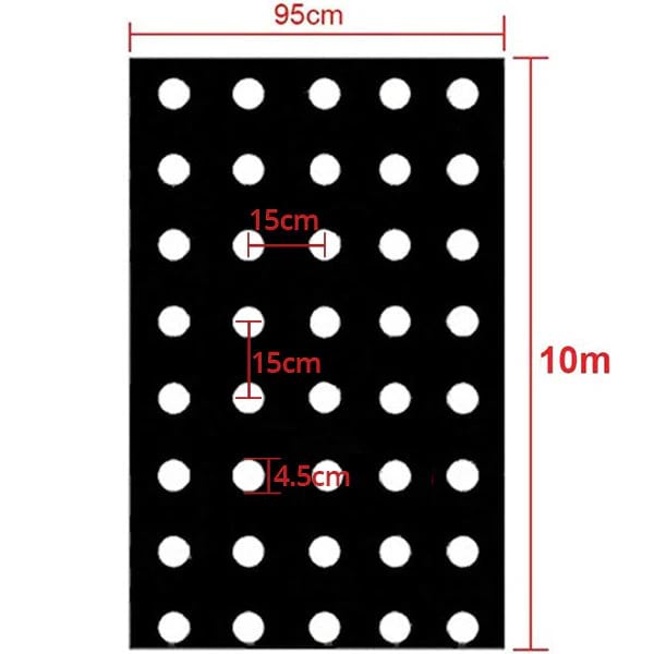 Veličina: 0.95 x 10 m Boja: Crna Materijal: Izdržljiva plastika Razmak rupa: 15 cm Prečnik rupe: 4.5 cm