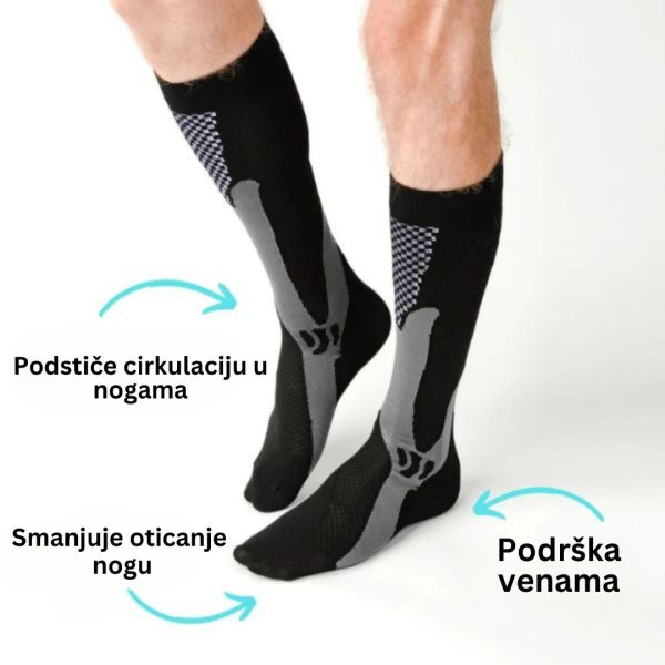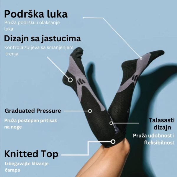 Ove čarape pomažu u poboljšanju protoka krvi, što znači manje umora i više energije za vaš dan. Savršeno za duge sate na nogama ili intenzivnu fizičku aktivnost.