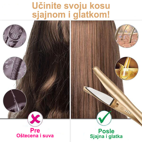 PTC metod grejanja i titanijumska ploča daju sjajniji i svileniji izgled za manje vremena i uklanjaju efekat frizza na duži period sa manje štete. Pogodno za sve tipove kose.