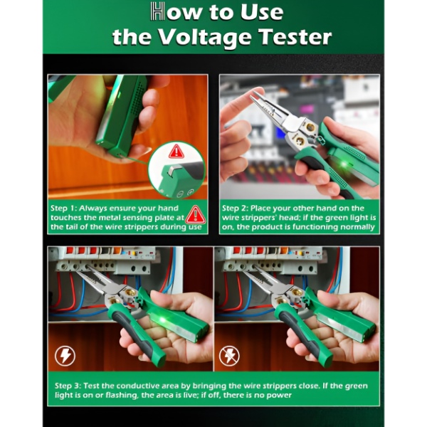 ⚡ Iebūvēts sprieguma testeris – uzreiz pārbaudiet strāvas ķēdes, nenoliekot instrumentu